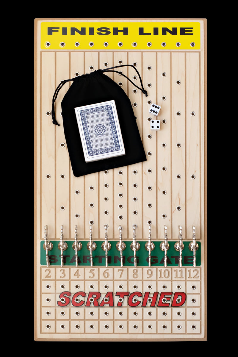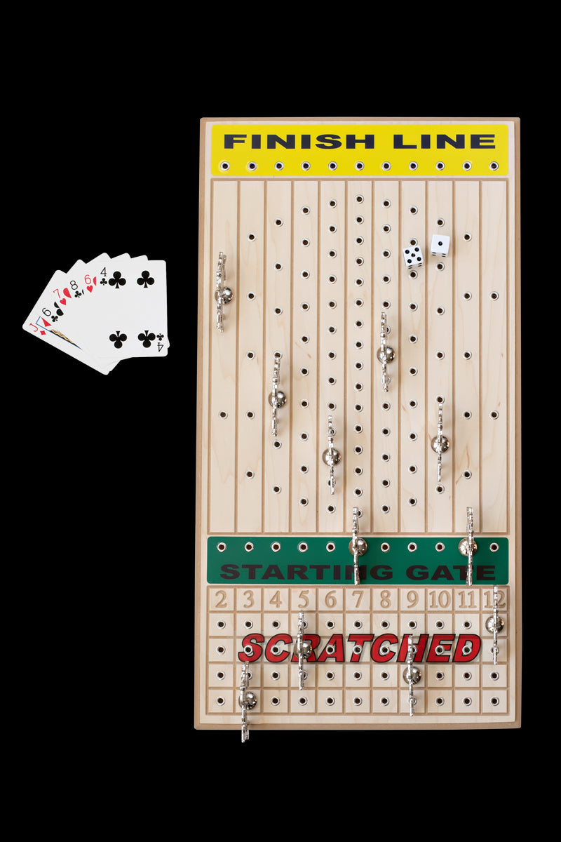 Line up the horses at the starting gate, deal the cards and begin rolling the dice to scratch horses and start building your “pot”. The remaining horses race to the finish line. Hold the winning horse’s card and you win! These are the highest quality handcrafted horseracing board games available.