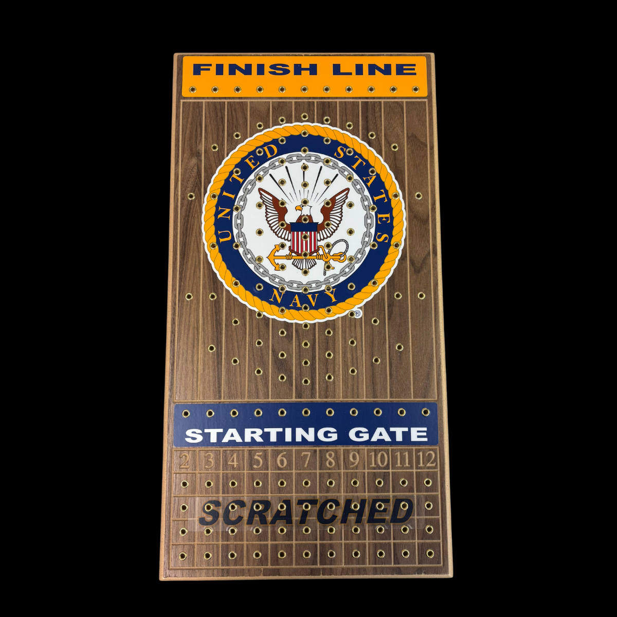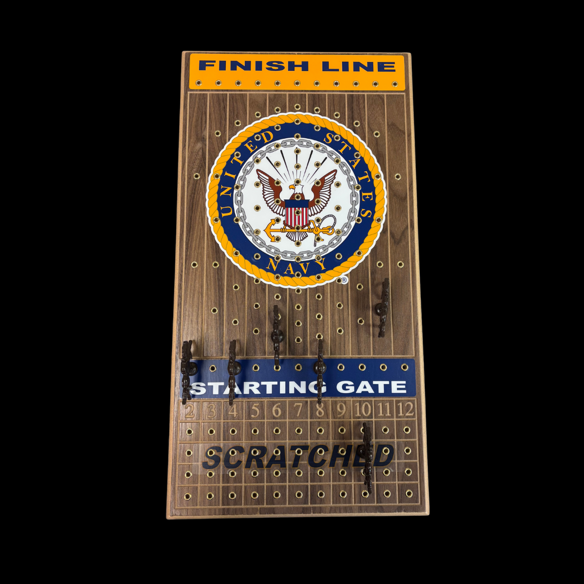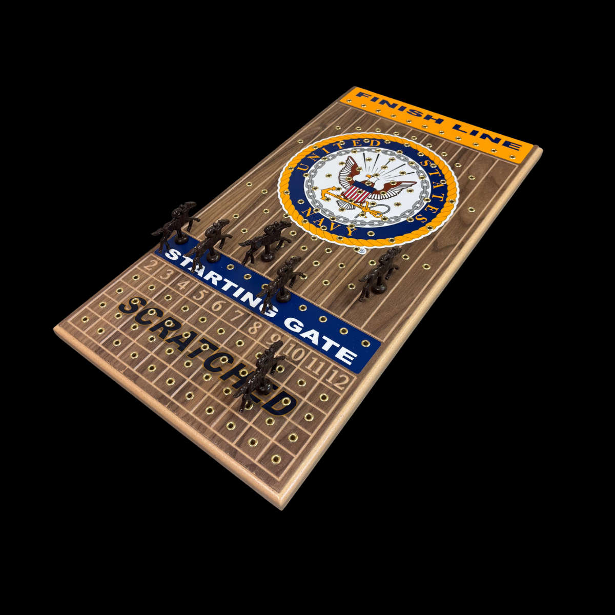 Line up the horses at the starting gate, deal the cards and begin rolling the dice to scratch horses and start building your “pot”. The remaining horses race to the finish line. Hold the winning horse’s card and you win! These are the highest quality handcrafted horseracing board games available.