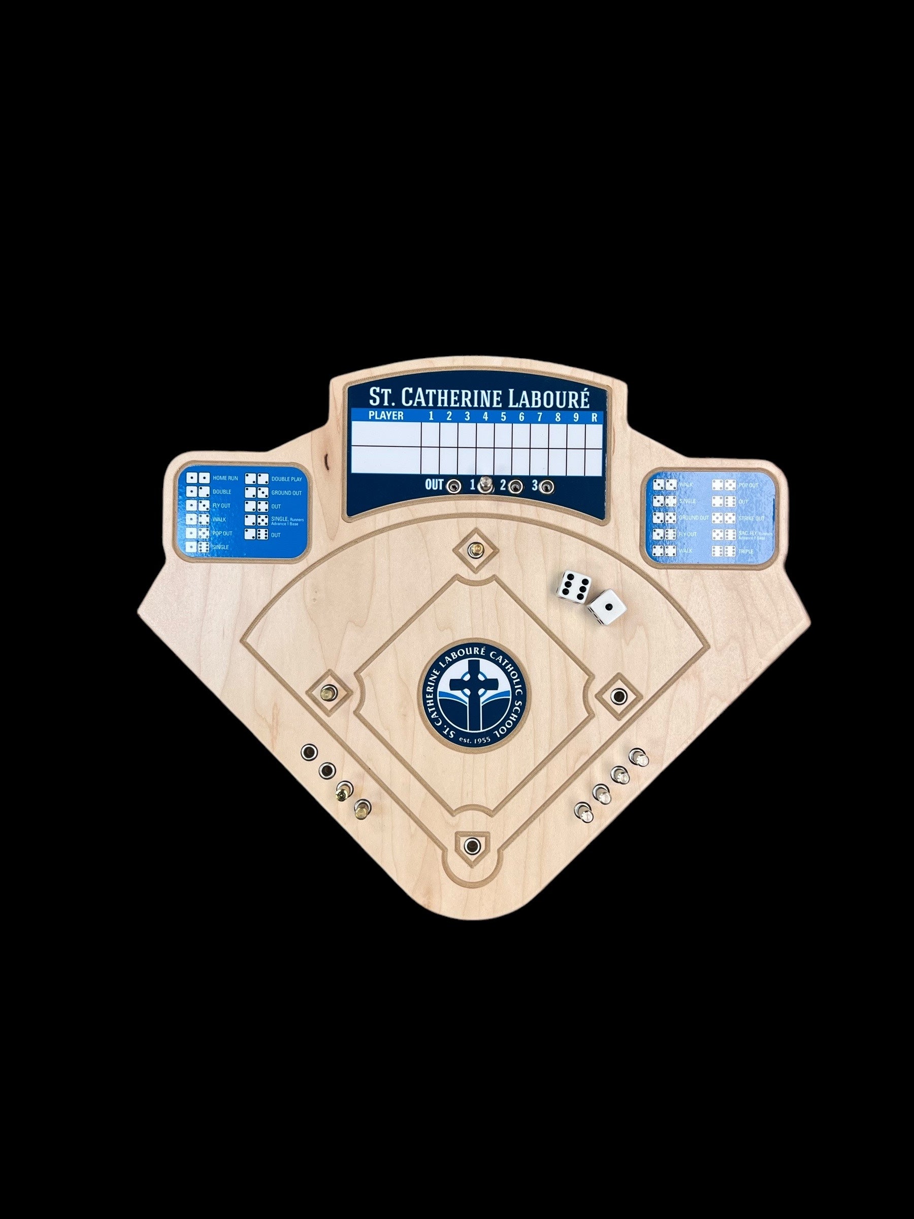 Hit a homerun with our handcrafted baseball game! Play ball! Move the first batter to home plate and roll the dice. Use the dice combination to determine the outcome of the at-bat and move accordingly. The dry erase scoreboard allows for quick and easy changes to team names and scores. This game is crafted from high quality materials.