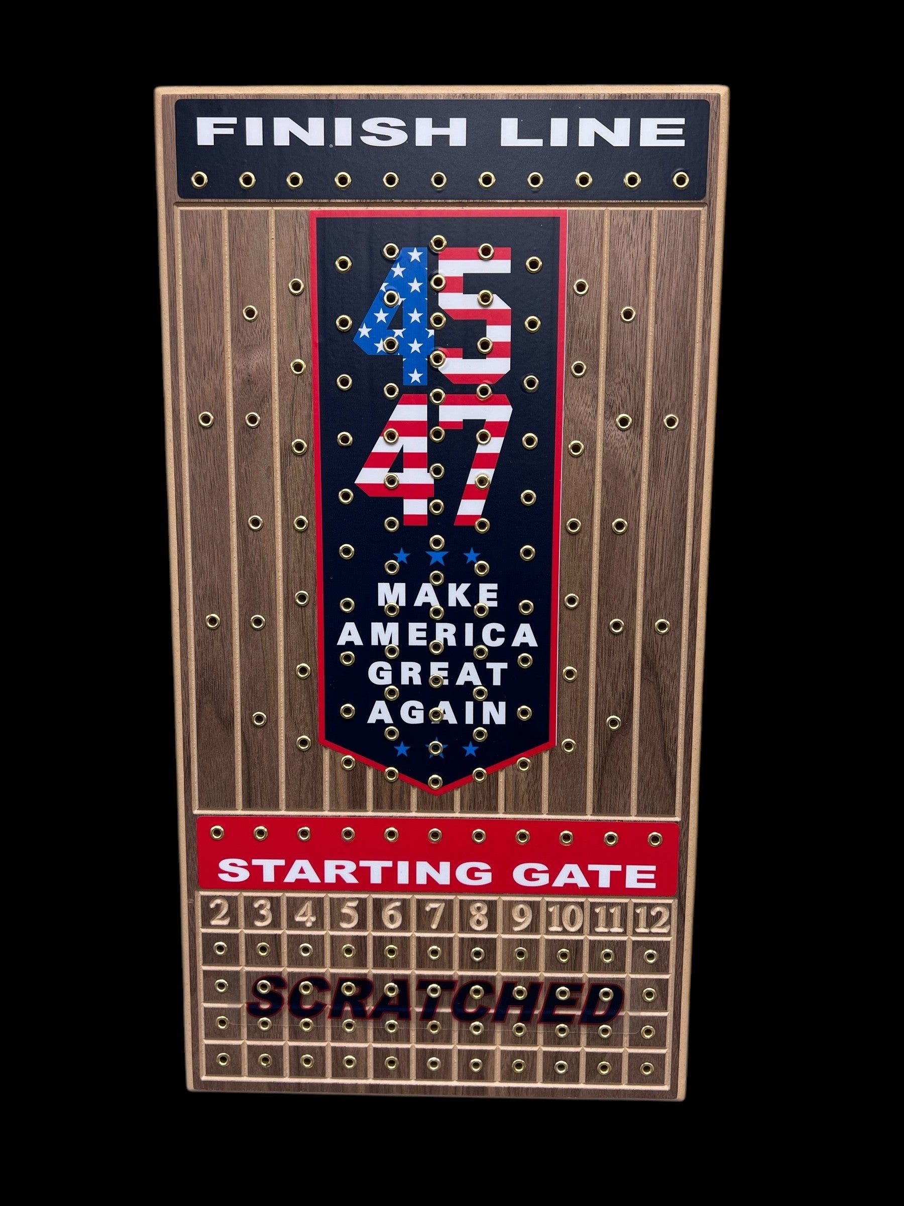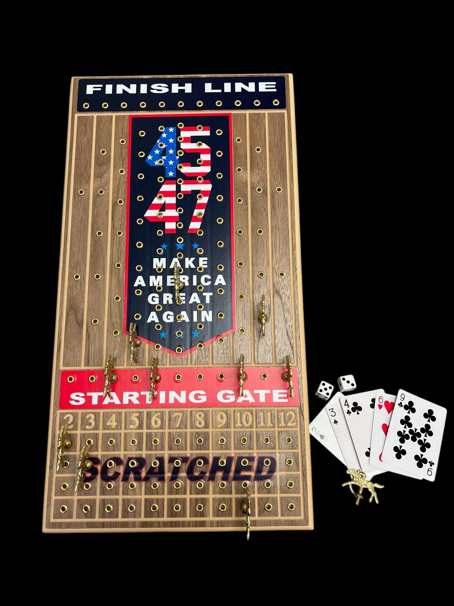 Line up the horses at the starting gate, deal the cards and begin rolling the dice to scratch horses and start building your “pot”. The remaining horses race to the finish line. Hold the winning horse’s card and you win! These are the highest quality handcrafted horseracing board games available.