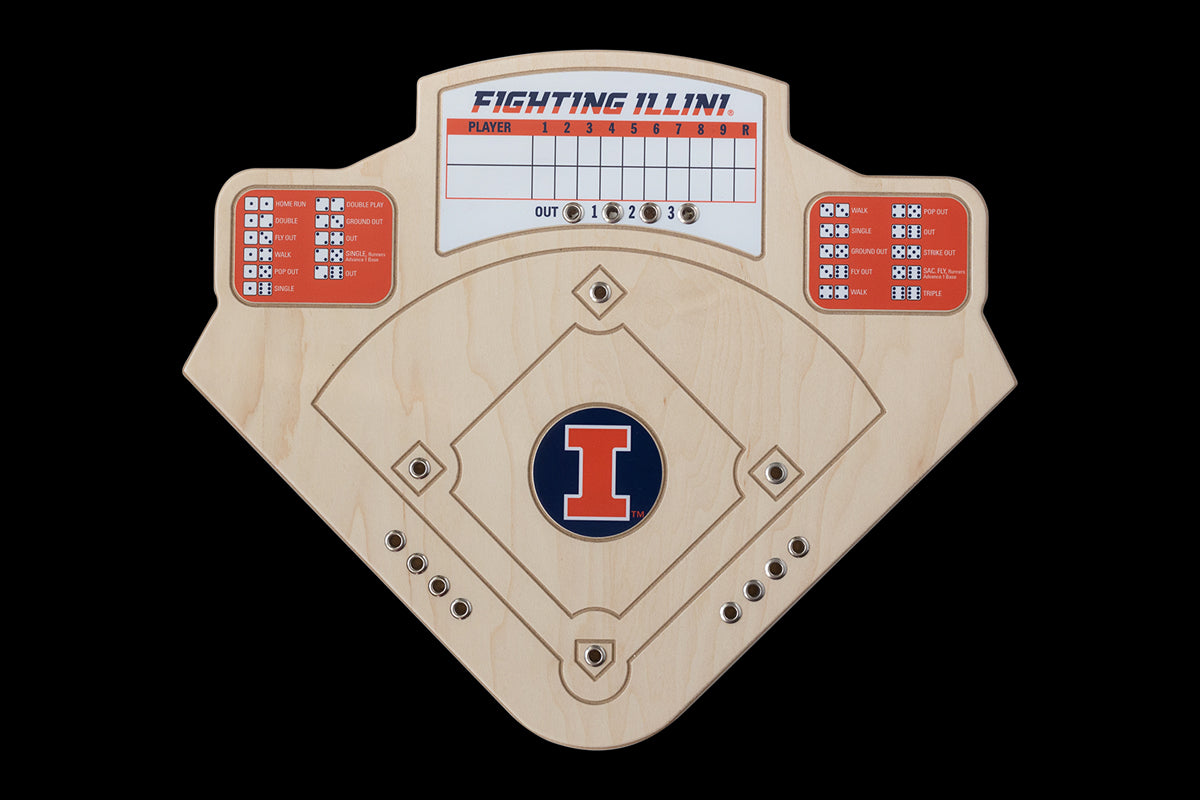 The unique baseball diamond shaped playing surface is constructed with a maple wood veneer. Includes a pair of dice, dry erase marker, five chrome pegs, four brass pegs and directions.